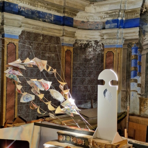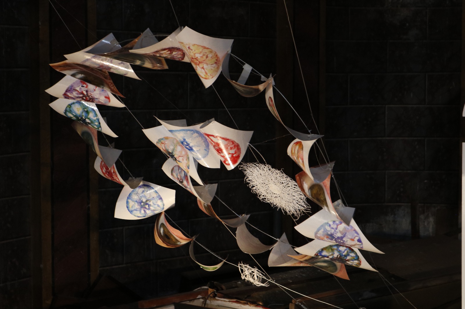 curve, brillare sospesa nei tondi fatti di bianchi fili e